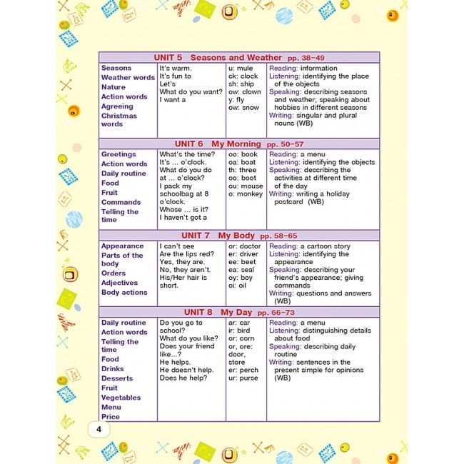 • У кожному розділі багато уваги приділяється формуванню та вдосконаленню основних мовних навичок письму, читанню, говорінню та розумінню англійської мови.