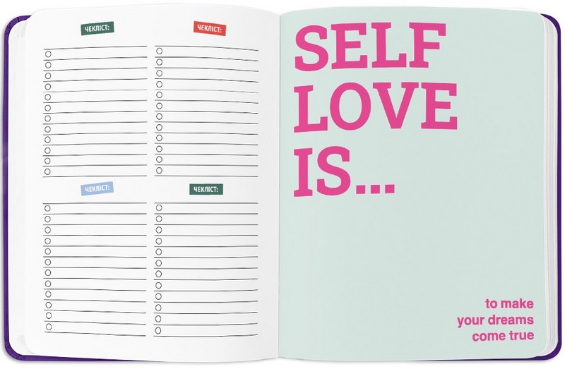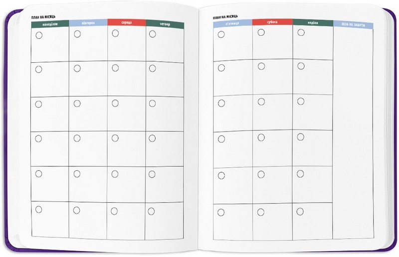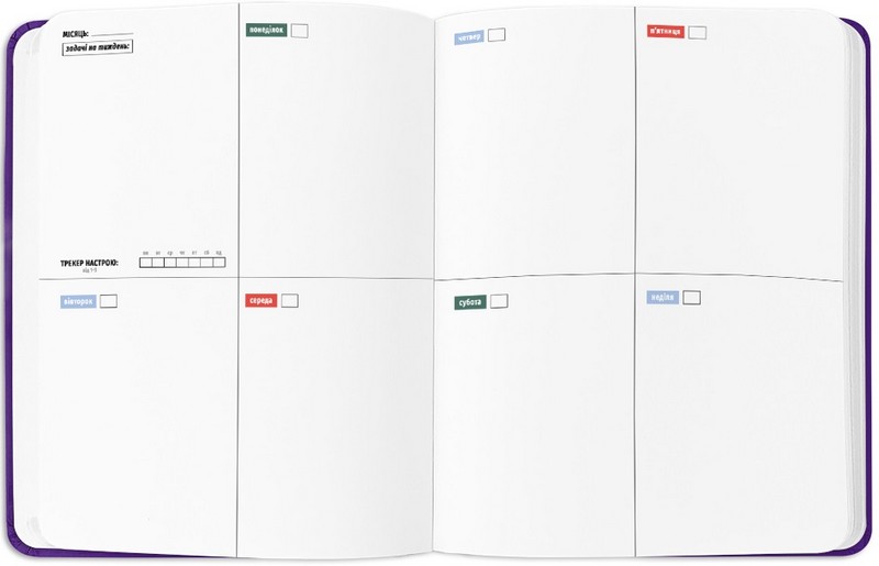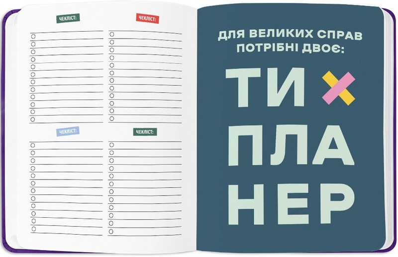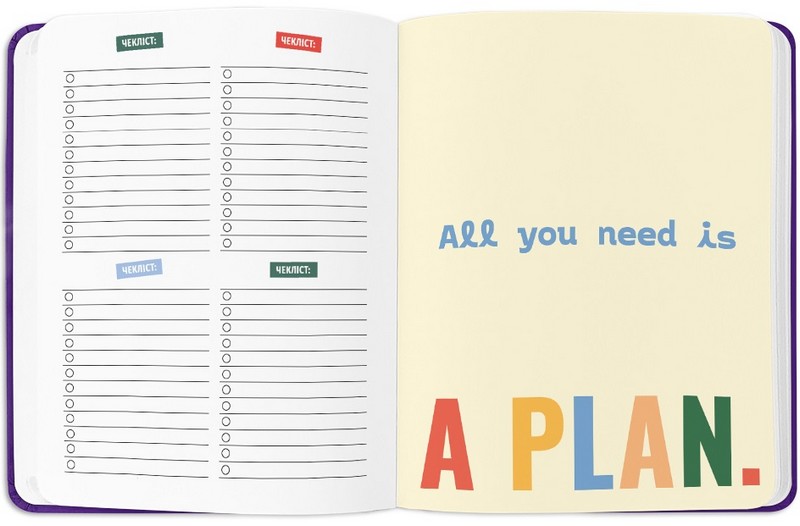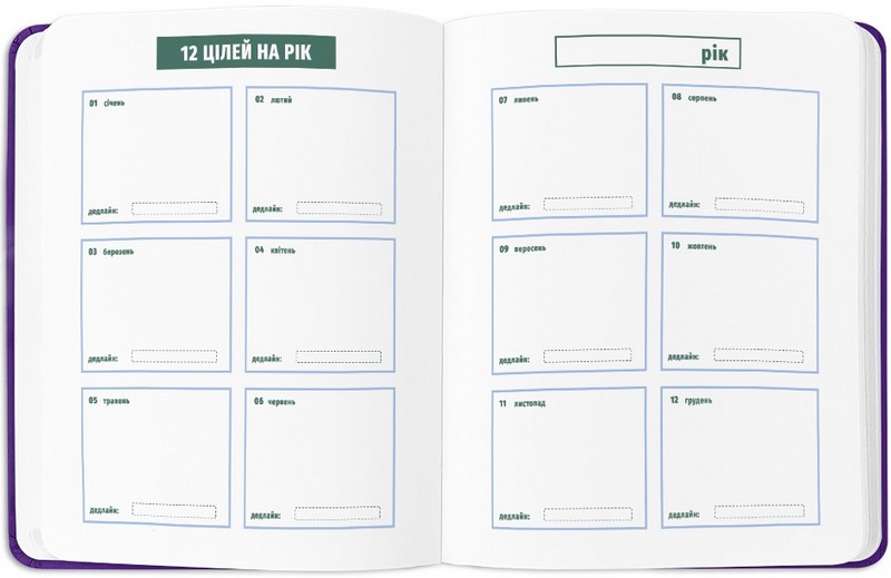- Додаткові розвороти: план цілей на рік, дошка бажань, вішлісти, трекер звичок, пусті ліновані сторінки для записів, розворот підсумків року
