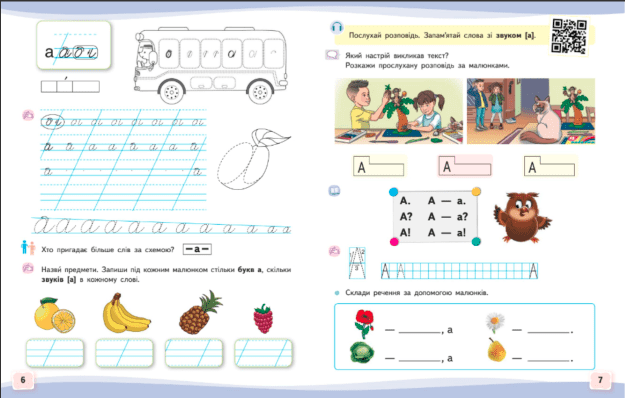 Посібник звернеться до дитини, заговорить і заспіває разом з нею. У QR-кодах із посиланнями на аудіофайли вміщено тексти для слухання, озвучені професійними дикторами, мовлення яких стане взірцем для учнів/учениць. Після завершення слухання відбувається робота над виконанням завдань, які спрямовані на перевірку розуміння усної інформації.