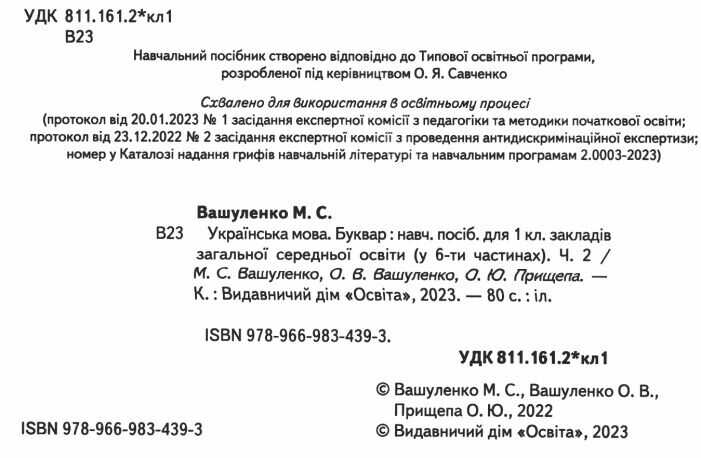 Навчальний посібник Українська мова Буквар 1 клас у 6-ти частинах Частина 2 НУШ Авт: Вашуленко М.С. та ін. Вид-во: Освіта 100820