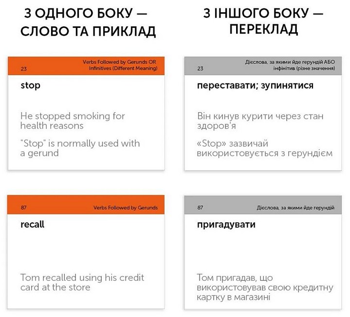 Набір карток «Gerund and Infinitive vol.1» (рівень А2-В1) — це перший набір серії «Граматика в картках» від English Student. У наборі є 105 карток із прикладами вживання герундія й інфінітива після дієслів та особливими випадками.