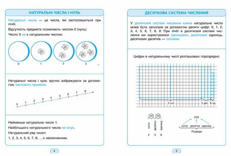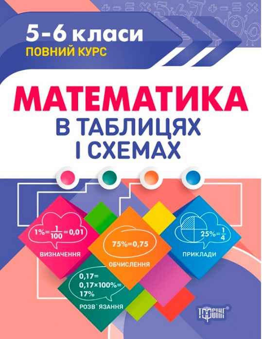 У посібнику у зручній формі таблиць і схем викладено основні математичні поняття, вивчення яких передбачено чинною програмою МОН України для 5-6 класів загальноосвітньої школи. Збірник містить практичні завдання для самостійного опанування матеріалу і приклади, докладно пояснюються розв'язання задач. Він стане у пригоді під час вивчення складних тем та закріплення пройденого матеріалу. Виклад матеріалу в таблицях та схемах сприяє кращому засвоєнню інформації та допомагає зосередити увагу на важливих правилах, фактах, формулах.