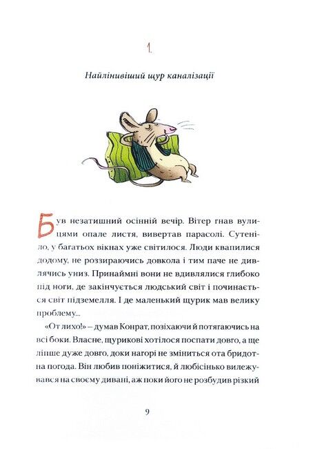 Книга розповідає про щура на ім’я Конрат, який любить затишок своєї каналізації, де можна поніжитися в рідному ліжечку. Зовні — суцільні небезпеки та неподобства! Однак час від часу все ж доводиться йти їм назустріч, бо треба щось їсти! І цього вечора голодний шлунок не залишає вибору бідолашному щурику. Але про яку вечерю може йтися, коли Конрат чує крик про допомогу?! Через це замість вечері наш герой вирушить у чудернацьку подорож, втрапить у велику катавасію та знайде нових друзів.