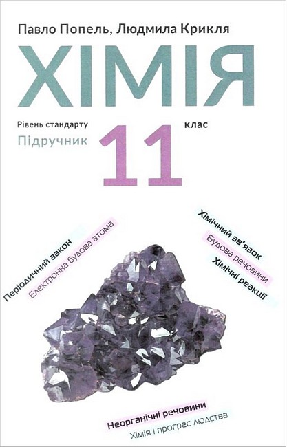 Підручник Хімія 11 клас Рівень стандарту Попель П. Крикля Л. Академія. Підручник підготовлено за навчальною програмою з хімії для 11 класу закладів загальної середньої освіти (рівень стандарту). У ньому узагальнено зміст періодичного закону, будову атомів і йонів, типи хімічного зв’язку та хімічних реакцій, розглянуто склад, будову, властивості та застосування найважливіших простих речовин і неорганічних сполук.