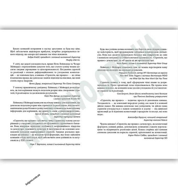 Стратегія що працює. Усі компанії прагнуть бути великими, але не всі цього досягають. Причину цього Пол Лейвланд і Чезаре Мейнарді вбачають у розриві між стратегією та її реалізацією. Автори аналізують досвід кількох світових корпорацій, яким це вдалося, і виокремлюють кілька основних принципів їхньої діяльності.