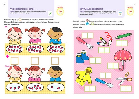 Основна увага у цьому зошиті надається завданням на розмірковування, вияв фантазії, зосередженість. Кожне завдання ретельно розроблено для розвитку конкретного досвіду. Однак, розглядаючи малюнки, ваша дитина також тішитиметься спілкуванням із вами.