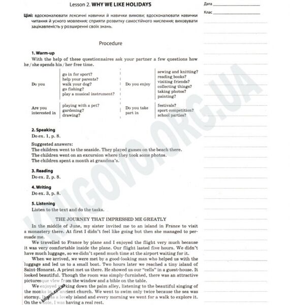 Посібник укладено відповідно до оновленої навчальної програми з англійської мови для 7 класу та повністю узгоджено з підручником А. М. Несвіт (видавництво «Генеза»). У ньому подано готові конспекти уроків на відривних аркушах, які містять усі необхідні структурні елементи — мету, тип уроку, перелік обладнання, етапи роботи, завдання для актуалізації знань, практичну частину та рефлексію.