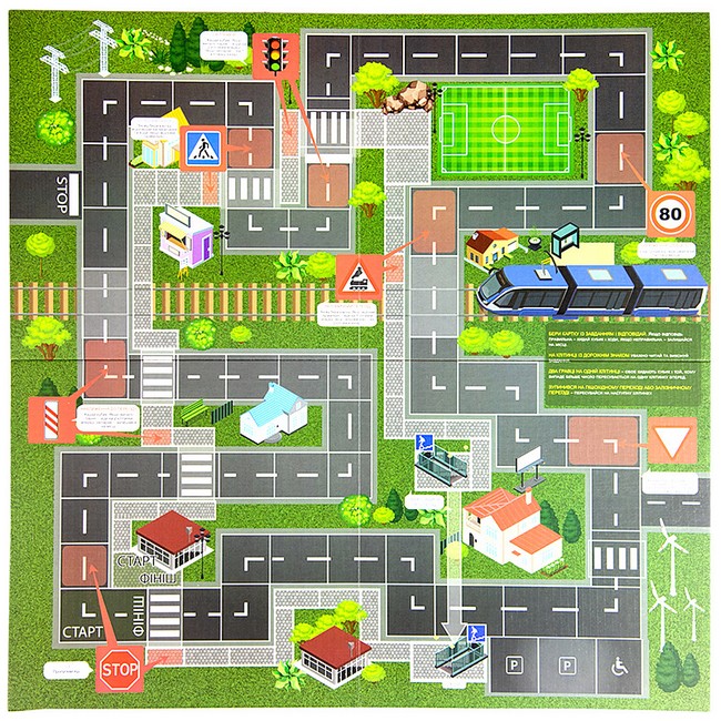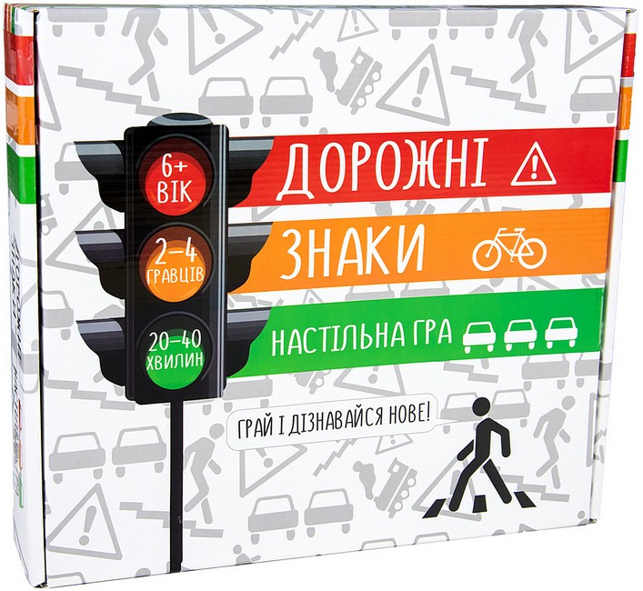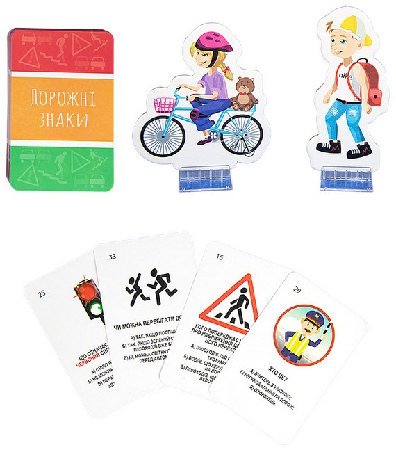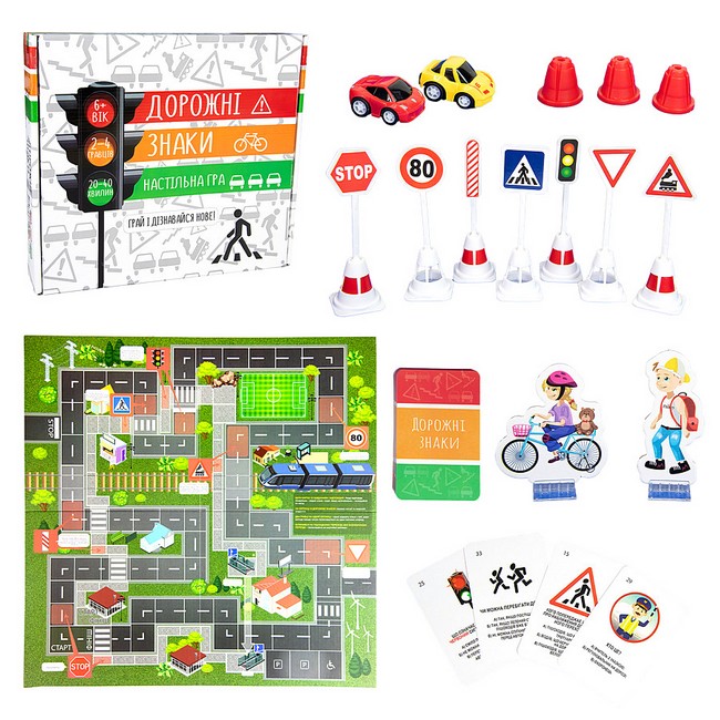 В комплекті «Дорожні знаки» є велике поле, по якому гравцям потрібно переміщати свої фішки, і кубик, а ціль гри – дійти до фінішу, дотримуючись правил дорожнього руху. Також в комплекті 55 карток з запитаннями та варіантами відповіді, за допомогою яких діти поступово запам'ятовують важливу інформацію.