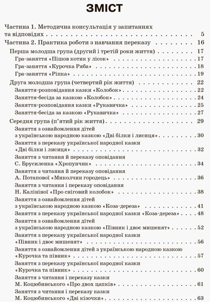 Посібник складається з двох частин. Першу подано у формі методичної консультації, що розкриває основні теоретичні аспекти навчання переказу. Друга частина презентує практичні розробки занять з ознайомлення дітей з художніми творами і формування навичок переказу. Наведені конспекти занять побудовані на основі використання найбільш продуктивних методів і прийомів навчання. Разом з посібником рекомендовано використовувати додаток "Наочний матеріал до посібника "Навчаємо дітей переказувати".