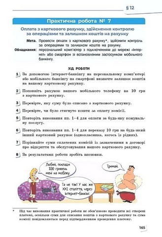 Підручник включає не лише теоретичний матеріал, а й практичні роботи, які допомагають учням застосовувати отримані знання в реальних ситуаціях. Зокрема, учні зможуть виконувати вправи на планування бюджету та розрахунок витрат, що сприятиме розвитку навичок управління фінансами.