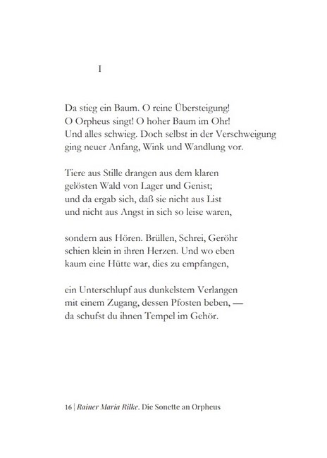 П’ятдесят п’ять сонетів, що належать до класики світової літератури. Їх Рільке написав у лютому 1922 року, коли мешкав у швейцарському замку Мюзо. У підзаголовку сонетів Рільке зазначає, що вони — надгробний пам’ятник для Вери Окама Кнопп. Ця дівчина була донькою товаришки Рільке, танцівницею і померла від лейкемії у віці вісімнадцяти років. Сонети до Орфея сповнені античних мотивів, зокрема ремінісценцій до міту про Орфея і Еврідіку. Водночас у них звучать рефлексії поета щодо його сучасности, модерної доби.