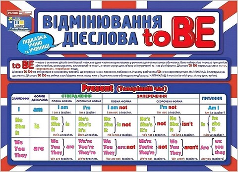 \nНа двох сторонах підказки ви знайдете всю необхідну інформацію про відмінювання дієслова To BE у різних часах: теперішньому (Present), минулому (Past) та майбутньому (Future).