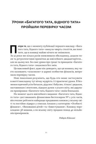\nХоча є контрольна подія, яку слід відзначити — збереження цілісності оригінального вмісту є свідченням того, що ця книга справді витримала випробування часом. Основні принципи, якими батьки, бабусі й дідусі — ті, хто прийняв історію та послання Роберта 25 років тому — діляться з новими поколіннями, які виявили, що позачасову мудрість і важливі уроки можна застосувати до життя будь-якої людини та її бачення майбутнього, яке включає контроль над своїми фінансами.