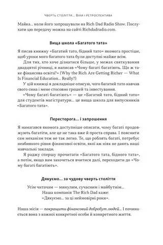 За чверть століття, що минула з моменту першої публікації «Багатого тата, бідного тата», у нашому світі змінилося так багато речей. Але єдине, що не змінилося — це нагальна потреба та потужність фінансової освіти. Гроші все ще є основою нашого життя, подобається це нам чи ні, і технології принесли у світ грошей як швидкість, так і інновації. У світі, що постійно змінюється, ми все ще можемо стати розумнішими, коли справа доходить до грошей… і навчитися якомога більше, щоб забезпечити своє майбутнє.