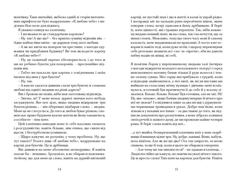 Джеремі дарує квіти й поважно ставиться до сказаних слів, Джеймс вираховує ризики та смакує грушеві пироги, Джейкоб проєктує будинки і мріє про нове чудове життя... Герої збірки вигадані й водночас справжні, чутливі та щирі. Трохи смішні, часом вразливі, подекуди наївні. Вони втрапляють у незручні ситуації, шукають із них вихід, а заразом і себе.