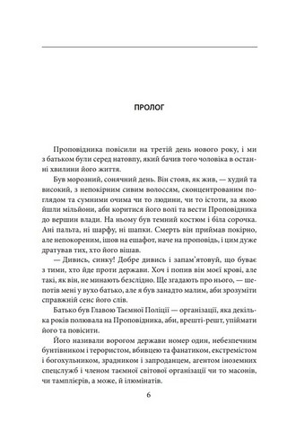 Магічний реалізм, у якому життя людства навіки поєдналося з посланцями Бога та прислужниками Сатани. Альтернативна історія з відвертим присмаком збочених людських бажань, непристойних сексуальних ігор і дитячих трагедій. Політичний роман, що описує Україну ХХІ століття після закінчення Визвольної війни проти загарбницької Росії. Оповідь про життя чоловіка, жорстокого та всесильного Глави Таємної Поліції України, який, щоб помститися своїм мертвим, змінив хід самої історії. Легенда про Проповідника — чи то людину, чи то істоту, чи то справжнього посланника Бога.