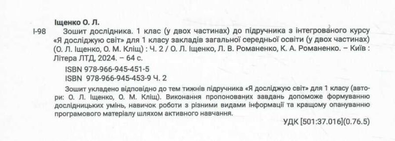 Зошит дослідника 1 клас Частина 2 НУШ До підручника Іщенко О.Л. Кліщ О.М. Авт: Іщенко О.Л. Романенко Л.В. Романенко К.А. Вид-во: Літера 100811