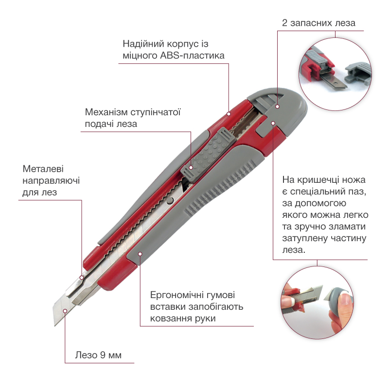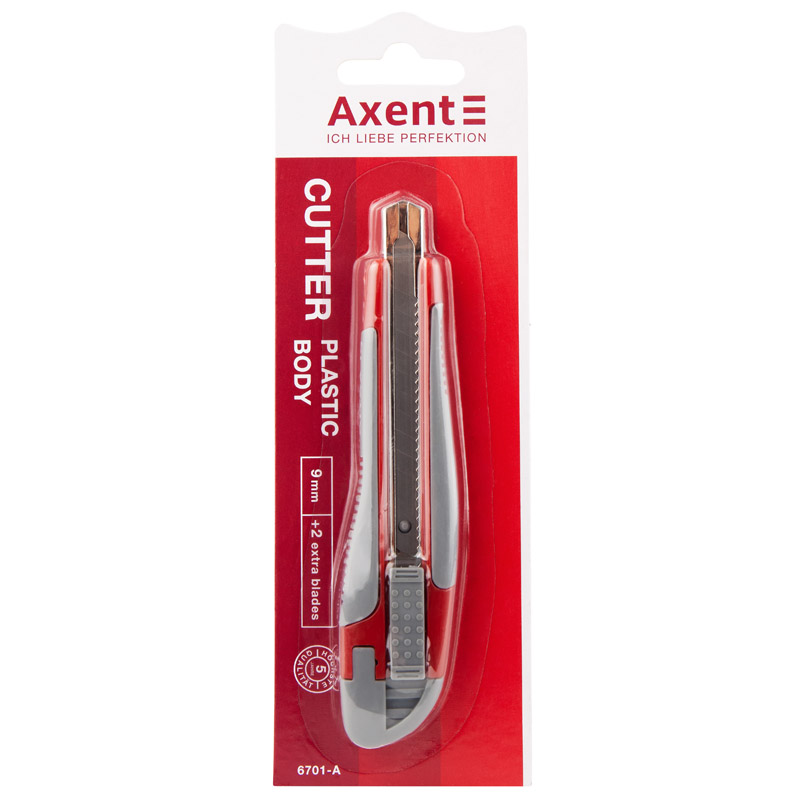 Канцелярський ніж Axent - це надійний, безпечний і довговічний інструмент для використання в офісі, на складі, на виробництві або в побуті завдяки поєднанню якості матеріалу, продуманості деталей і надійності механізму. Сталеве багатосекційне лезо забезпечує найвищу функціональність, стійкість, гостроту. Міцний пластиковий корпус стійкий до навантажень, не розбивається при падінні. Металевий механізм ступінчастої подачі леза забезпечує безпечну роботу, надійний механізм фіксації виключає ризик раптового випадіння або провалювання леза. Кришечка з пазом дозволяє просто і безпечно обламати затуплену частину леза уздовж лінії насічки і продовжувати користуватися гострим лезом. Ергономічний дизайн корпусу адаптований під форму долоні, гумові вставки запобігають ковзанню руки. Плюс 2 запасних леза!