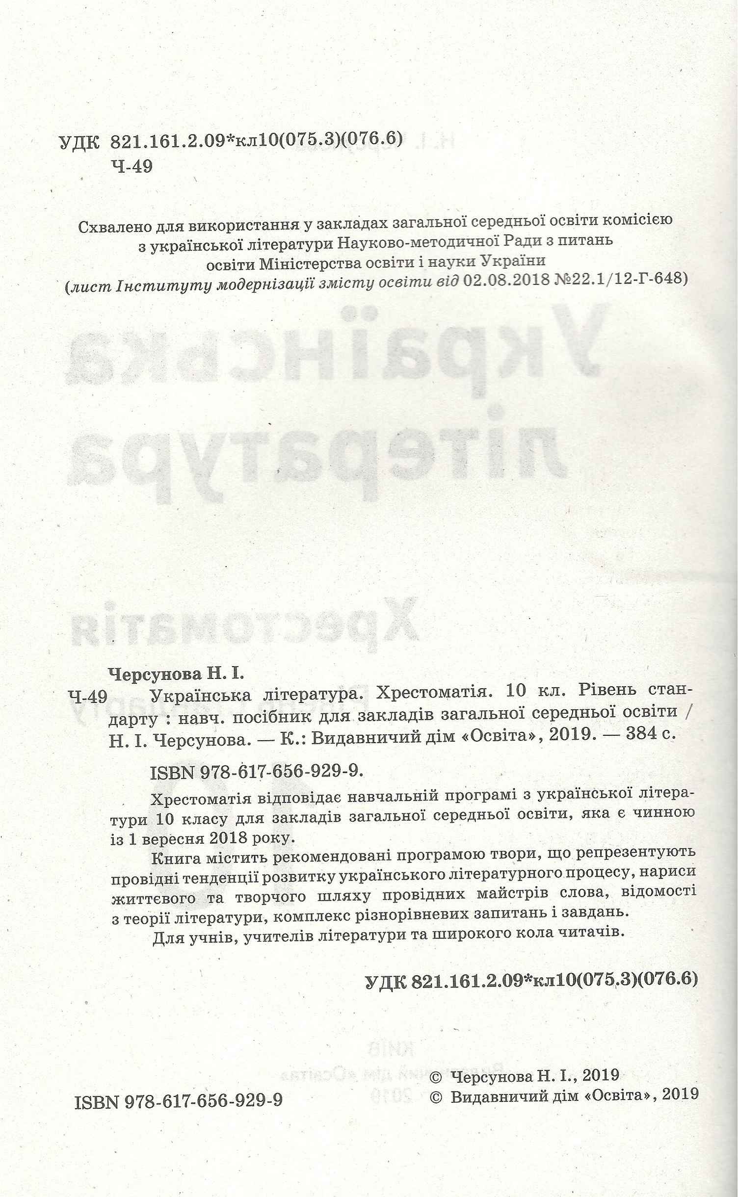 Українська література Хрестоматія 10 клас Рівень стандарту Черсунова Н. Освіта відповідає навчальній програмі з української літератури 10 класу для закладів загальної середньої освіти, яка є чинною із 1 вересня 2018 року. Для учнів, учителів літератури та широкого кола читачів.