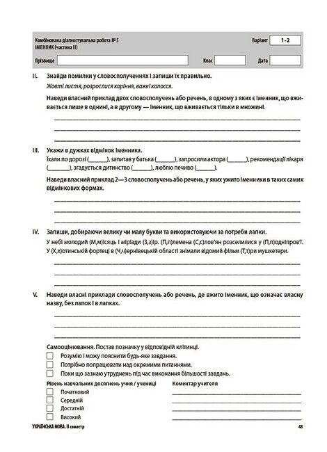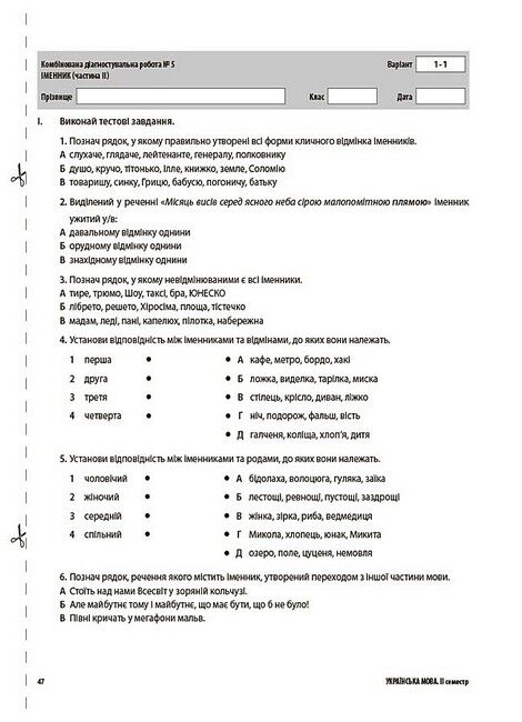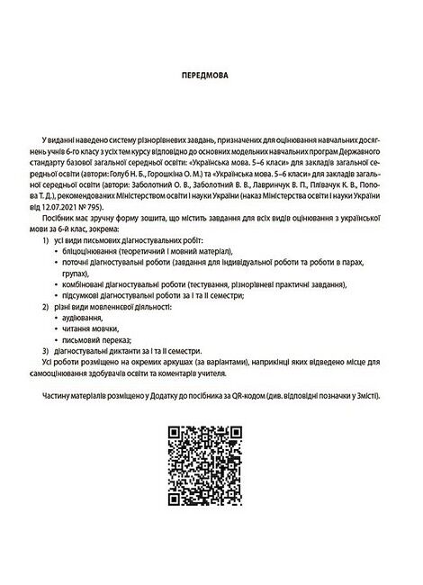 Посібник містить систему різнорівневих завдань для оцінювання навчальних досягнень учнів 6-го класу з усіх тем курсу української мови відповідно до основних модельних навчальних програм, рекомендованих Міністерством освіти і науки України (наказ Міністерства освіти і науки України від 12.07.2021 № 795). Завдання дібрано для бліцоцінювання, поточних, комбінованих, підсумкових діагностувальних робіт та оцінювання різних видів мовленнєвої діяльності. Роботи розміщено на окремих аркушах зручного формату (за варіантами), наприкінці яких відведено місце для самооцінювання.