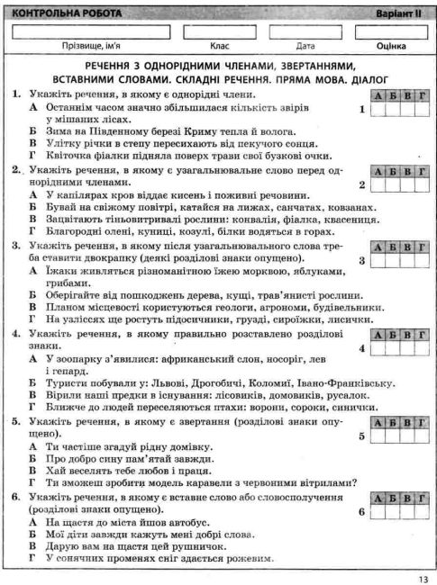 Посібник дозволяє проводити протягом навчального року всі контрольні роботи, передбачені новою програмою, не залучаючи будь-які інші посібники. Завдання розроблено в форматі зовнішнього незалежного оцінювання. Унікальна інтернет-підтримка для підготовки до кожної контрольної роботи. Зміст завдань дозволяє використовувати посібник у комплекті з будь-яким чинним підручником Українська мова для 5 класу шкіл з українською мовою навчання за Новою програмою.