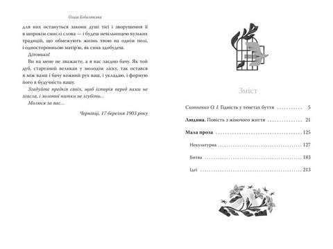 \nУ цьому виданні надруковано перлини прозової творчості письменниці: повість «Людина», новели «Некультурна», «Битва», «Ідеї», поезії в прозі «Мої лілеї» та ін. Читач знайде в книжці тексти, які хоч і описують суспільство кінця ХІХ — першої половини ХХ століття, але звучать напрочуд по-сучасному, бо порушують проблеми прав жінок, збереження природи, байдужості, війни, красивого та потворного. Усе це бентежило тогочасних людей не менше, ніж нас у нинішню гірку добу. Проте згадані теми Ольга Кобилянська завдяки віртуозному володінню художніми засобами, умінню створювати імпресіоністичні за духом словесні картини, уважності до деталей подала в мистецьких неперевершених полотнах. Манері Ольги Кобилянської властивий романтичний погляд на світ і, найголовніше, незглибима любов до людини й природи. Її твори неповторні, сповнені людяності й наснажують життям.
