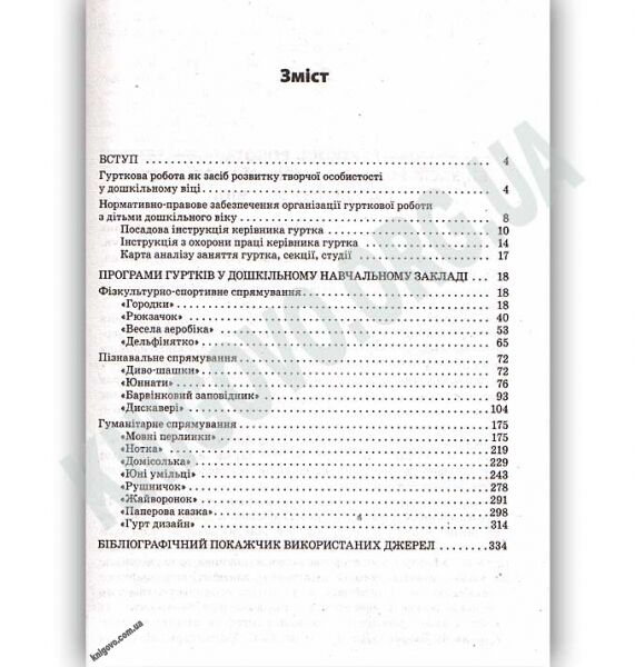 Посібник містить чинні документи з нормативно-правового забезпечення організації гурткової роботи, зразки ведення документації гуртка та вимоги до неї, орієнтовне планування роботи гуртка, вимоги до створення програми, методичні рекомендації щодо організації гурткової роботи в дошкільному навчальному закладі, програми гурткової роботи за різним спрямуванням фізкультурно-спортивне, пізнавальне, гуманітарне, художньо-естетичне, які допоможуть педагогічним працівникам творчо розвивати дошкільників в освітньому просторі дошкільної установи.