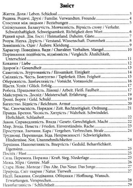 У довіднику зібрано понад 400 німецьких прислів'їв та їхніх українських відповідників. Він складається з двох частин: німецько-української та українсько-німецької. Матеріал розміщено за тематичними розділами, що охоплюють основні життєві ситуації. Правопис відповідає сучасним вимогам граматики німецької мови.
