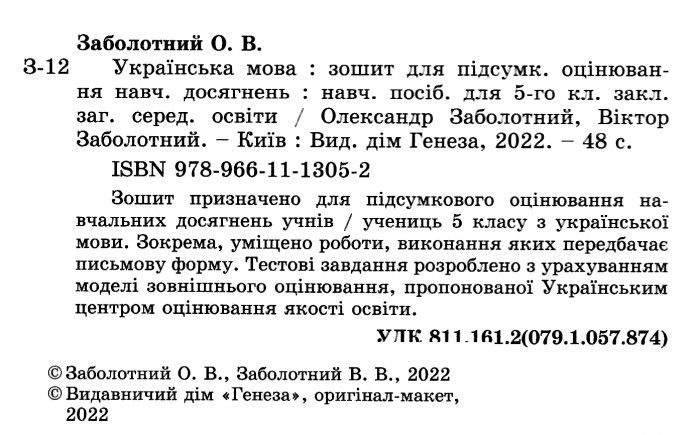 Зошит для підсумкового оцінювання навчальних досягнень Навчальний посібник для 5 класу закладів загальної середньої освіти Посібник містить діагностичні (контрольні роботи), за допомогою яких можна оцінити навчальні досягнення учнів та учениць з української мови: • шість робіт для тематичного оцінювання, • дві роботи для семестрового контролю, • одну роботу для оцінювання вміння сприймати письмовий текст. Кожна робота для тематичного оцінювання та робота для семестрового контролю складається з 12 завдань різного виду і подана у двох варіантах. Біля завдань указано максимально можливу кількість балів за виконання. Для перевірки правописних навичок у зошиті передбачено місце для диктанту. Для оцінювання вміння логічно й зрозуміло викладати думки, доречно вживати слова, грамотно писати учням та ученицям пропонується написати переказ та твір. Крім оцінювання роботи за 12-бальною шкалою, учитель / учителька може висловити загальне враження від діяльності учнів / учениць. Для цього в кінці кожної роботи запропоновано словесні характеристики, біля яких учитель / учителька за бажанням поставить одну або кілька позначок.