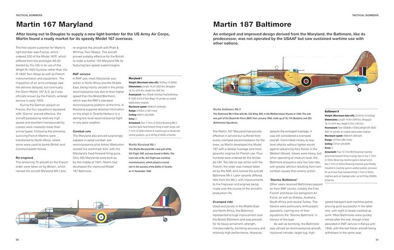 The guide is illustrated with profile artworks and three-views, as well as two-page dynamic artworks of some of the more famous aircraft in service, such as the highly- adaptable B-25 Mitchell, which served in every theatre in a variety of roles, the Douglas Dauntless SBD naval scout plane, and the Martin B-26 Marauder, one of the fastest medium bombers of its era.