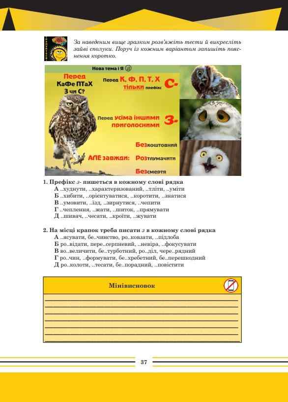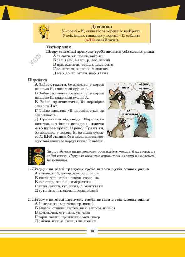 Теми також включають зміни оновленого правопису, малюнки-підказки («меми») та тести-зразки. У зошиті вміщено авторські завдання та теми для есе (у форматі ЗНО), а також завдання ЗНО минулих років із відповідями.