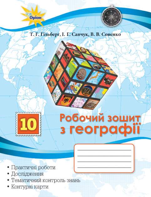 Робочий зошит Географія 10 клас Гільберг Т. Оріон. Робочий зошит з географії містить практичні роботи, дослідження, тематичний контроль знань та контурні карти. Структура зошита відповідає послідовності тем у програмі та підручнику Географія 10 клас Тетяни Гільберг, Івана Савчука та Валерія Совенко.