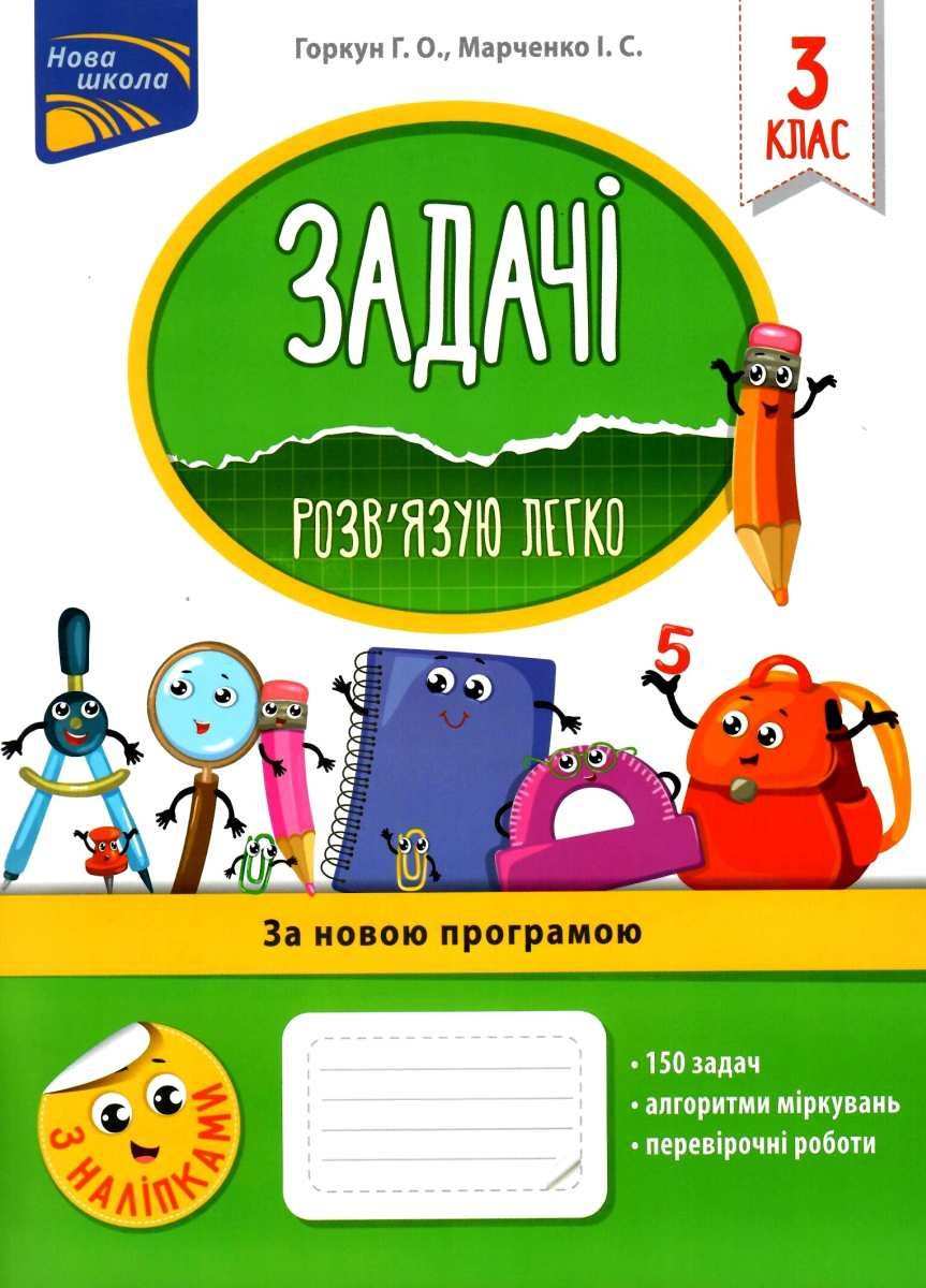 Задачі 3 клас Розв'язую легко Нова школа з наліпками. Має чітку та оригінальну структуру. Містить завдання різного рівня складності, та системні перевірочні роботи. Включає в себе: 150 задач, алгоритми міркувань.