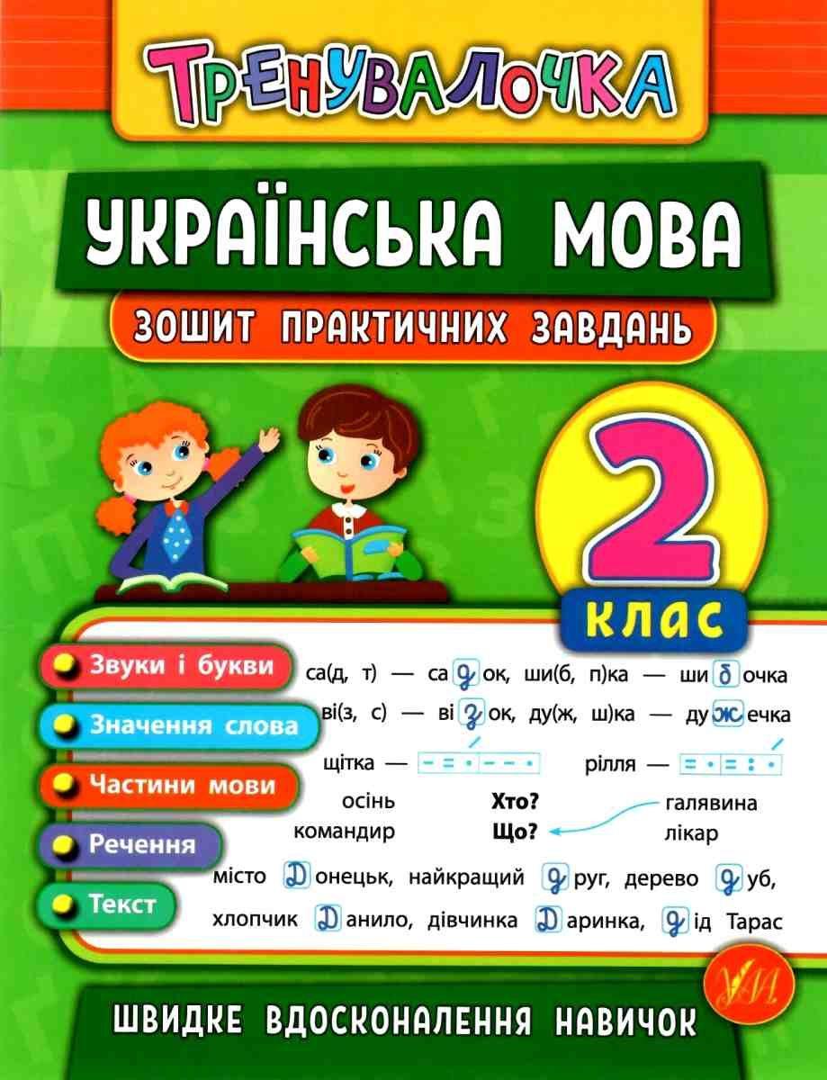 Тренувалочка Українська мова 2 клас Зошит практичних завдань. Посібник допоможе учням 2 класу вдосконалити навички роботи з буквами і звуками, повправлятися в правописі апострофа, великої літери, неоглушених приголосних і поділі слів на склади, закріпити знання про іменник, прикметник та дієслово, а також про слово, речення й текст.