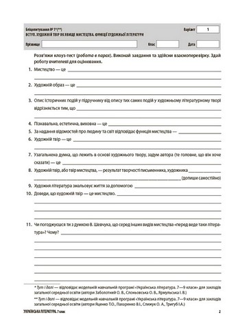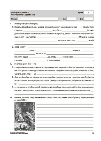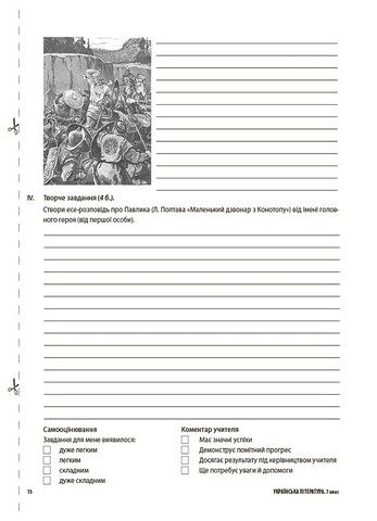 \nУ посібнику, що має зручну форму зошита, наведено завдання для всіх видів оцінювання із зарубіжної літератури за 7-й клас, зокрема: