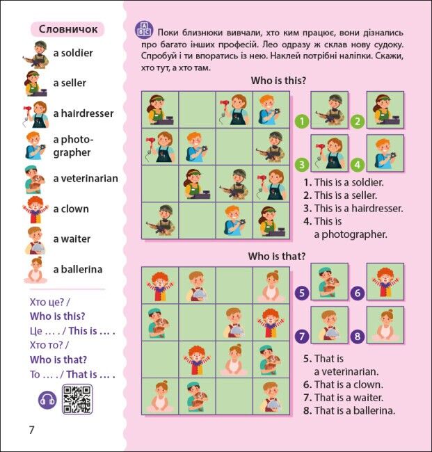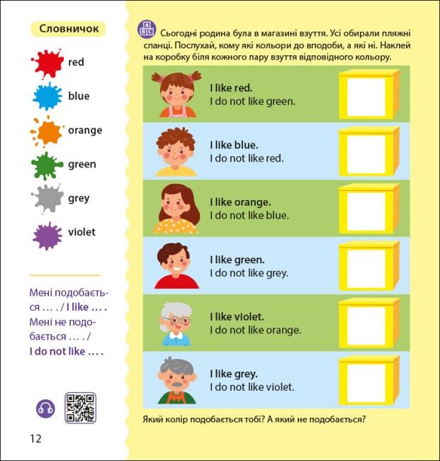 - Аудіосупровід: Книга супроводжується аудіоматеріалами, що дозволяють дітям слухати правильну вимову англійських слів та фраз. Це сприяє розвитку навичок аудіювання та вивченню мови в автентичному контексті.
