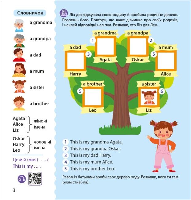 «Англійська з наліпками» — серія для першого знайомства з простою часто вживаною лексикою англійської мови з аудіосупроводом. У зошиті «Лео та Ліз знайомлять із родиною», головні герої — веселі близнюки Лео та Ліз, запрошують дитину більше дізнатися про родичів і навчають спілкуватися англійською. Різноманітні ігрові завдання, які тісно пов’язані з життям дітей, спонукають дошкільника до активного вживання англійської лексики. Книга містить також прості поради для батьків. Корисно для дітей 3-6 років.