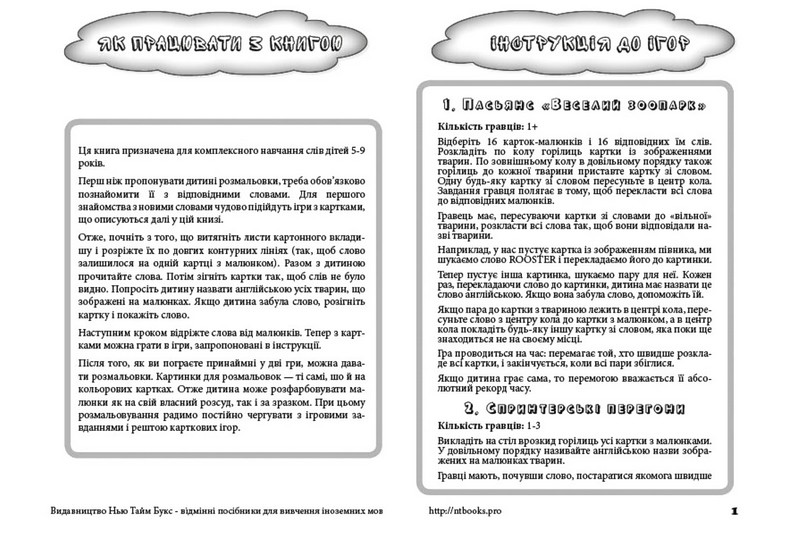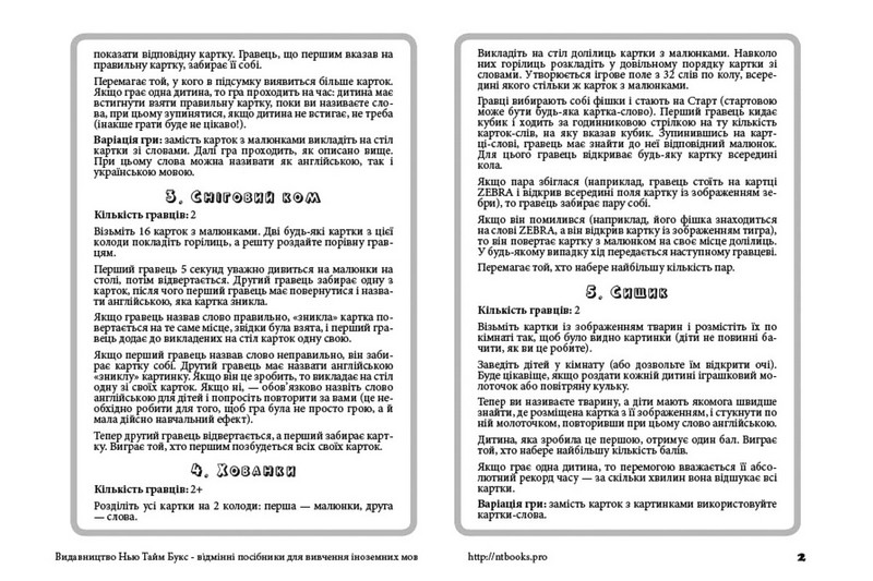 Важливим складником цієї розмальовки є 32 кольорові картонні картки з підписами англійською мовою і 5 ігор з цими картками.