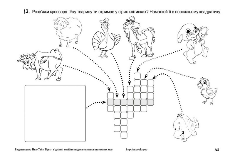 Саме тому в книгу війшли різнотипні завдання, які вчать дитину правильно писати англійські слова на тему «Свійські тварини». Тут дітям потрібно буде і розплутати «заплутані» слова, і скласти слова з букв, і розгадати кросворд, і вписати відсутні літери.