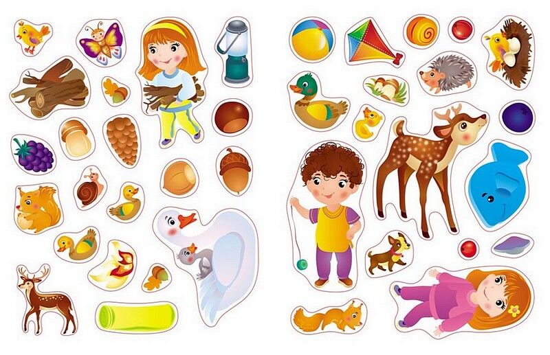 - 39 наліпок із зображеннями різноманітних елементів природи, які можна зустріти в лісі та парку, таких як дерева, квіти, тварини та багато іншого.