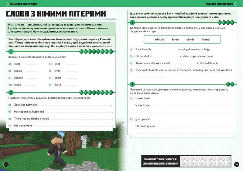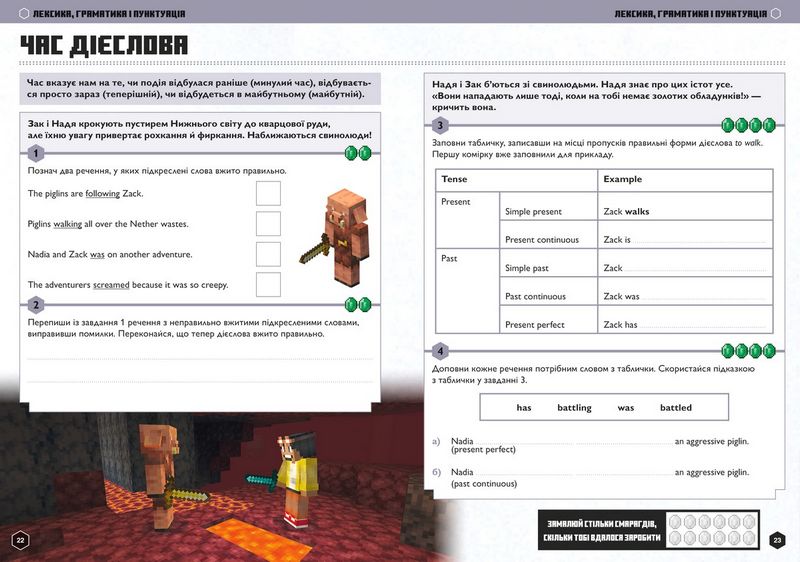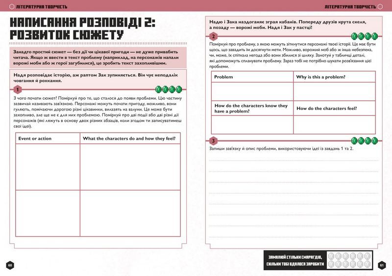 • У кожній пригоді ваша дитина виконає базові завдання з обраної теми й отримає в нагороду певну кількість смарагдів. Згодом їх можна буде «обміняти» на останній сторінці.