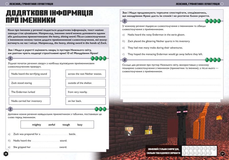 Ваша дитина вирушить у кілька пригод дивовижним світом Minecraft, вдосконалюючи знання англійської мови в процесі. Вирушайте у пригоду світом Minecraft завдяки посібнику! Ігрові персонажі, Том і Єва, які зустрінуться читачеві на сторінках посібника, виконують непрості місії і відважно шукають скарби... повсякчас відбиваючись від надокучливих мобів!Чому варто придбати: