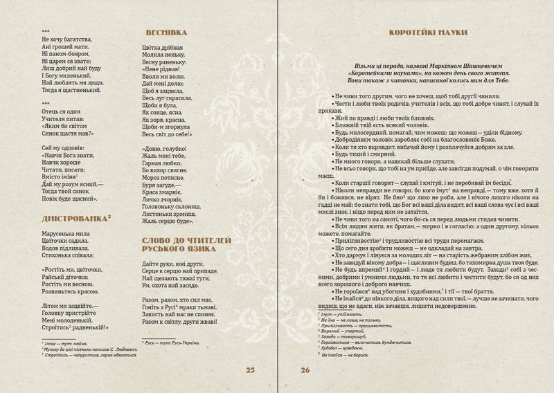 До збірки увійшли вірші, байки, поезії та переклади Маркіяна Шашкевича. Книга адресована дітям, батькам та вчителям.