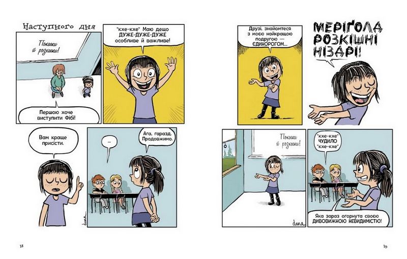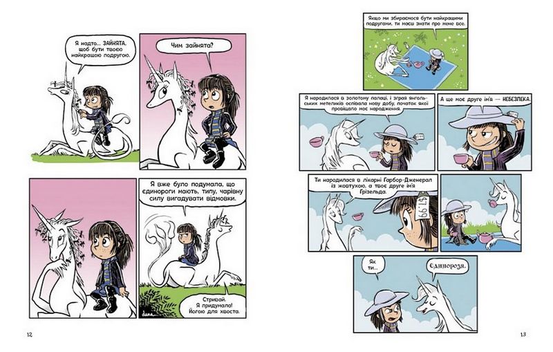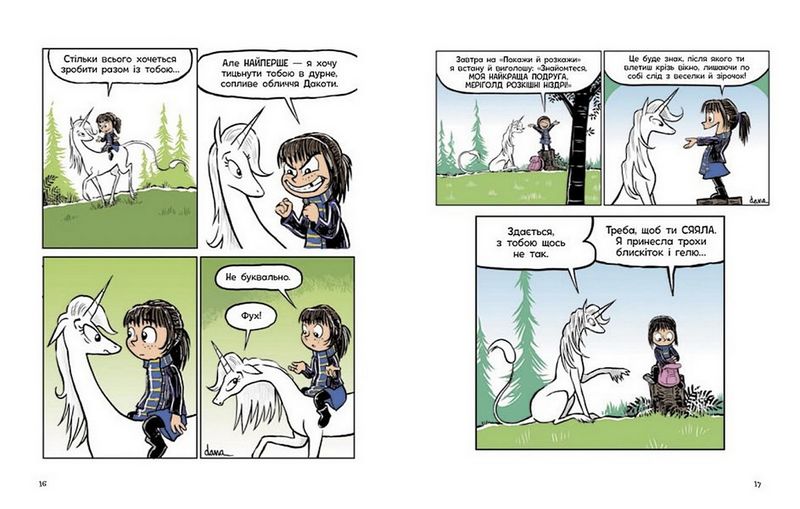 «Фібі та єдинорозя» — це смішний мальопис про дружбу дев’ятирічної дівчинки та єдиноріжки на ім’я Меріґолд Розкішні Ніздрі. У ньому чарівні події тісно переплітаються з буденними проблемами школярки, яка відчайдушно бажає визнання однокласників, шукає порозуміння з батьками, не хоче ходити на уроки фортепіано… Із чим у Фібі точно немає проблем — так це із почуттям гумору і сарказмом: вони з Меріґолд чи не на кожній сторінці сиплять в бік одна одної гострими жартами.