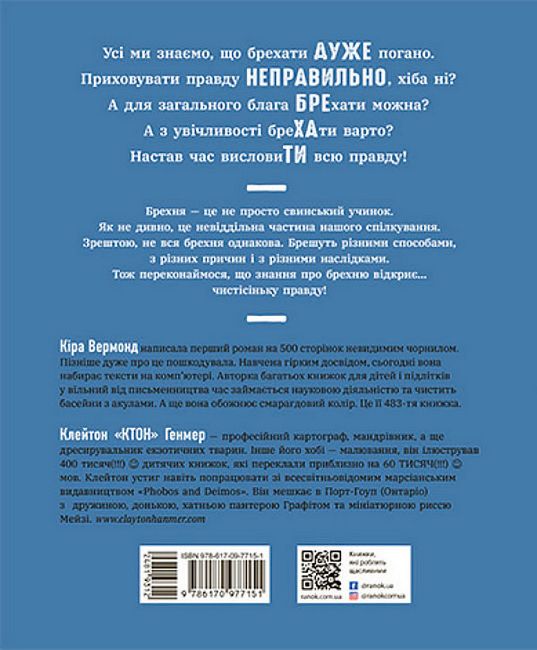 Докопаймося до правди! Бо, зрештою, це дуже цікаво й весело: слухати, як хтось бреше і як виявляють брехуна! А тут ще й класні кольорові ілюстрації Клейтона Генмера і купа немислимих, чудернацьких історій та неймовірних фактів. Нудно не буде не лише дітям, для яких створена ця книжка, але й дорослим!- ISBN9786170977151