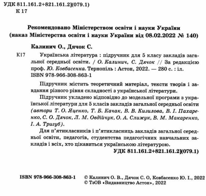 Підручник Українська література 5 клас НУШ Авт: Калинич О.В. Дячок С.О. Вид-во: Астон 85221