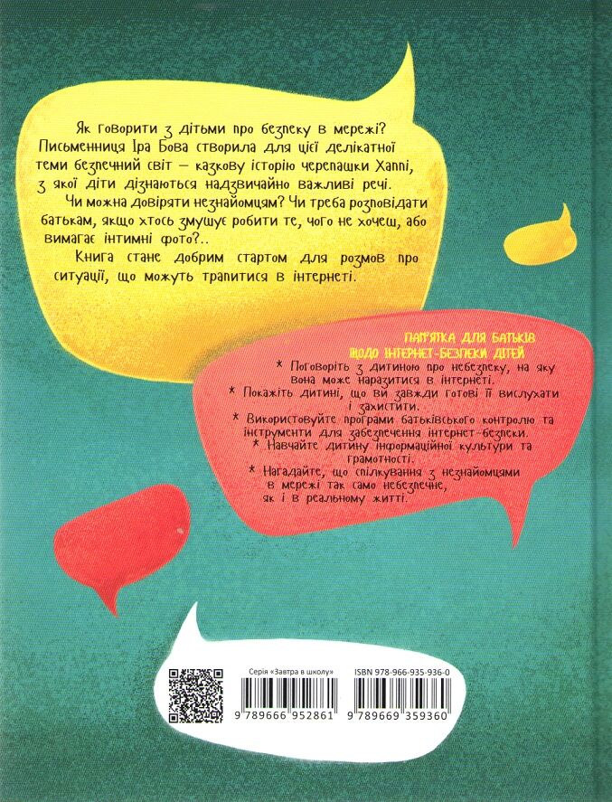 Як говорити з дітьми про безпеку в мережі? Письменниця Іра Бова створила для цієї делікатної теми безпечний світ — казкову історію черепашки Хаппі, з якої діти дізнаються надзвичайно важливі речі. Чи можна довіряти незнайомцям? Чи треба розповідати батькам, якщо хтось змушує робити те, чого не хочеш, або вимагає інтимні фото?..