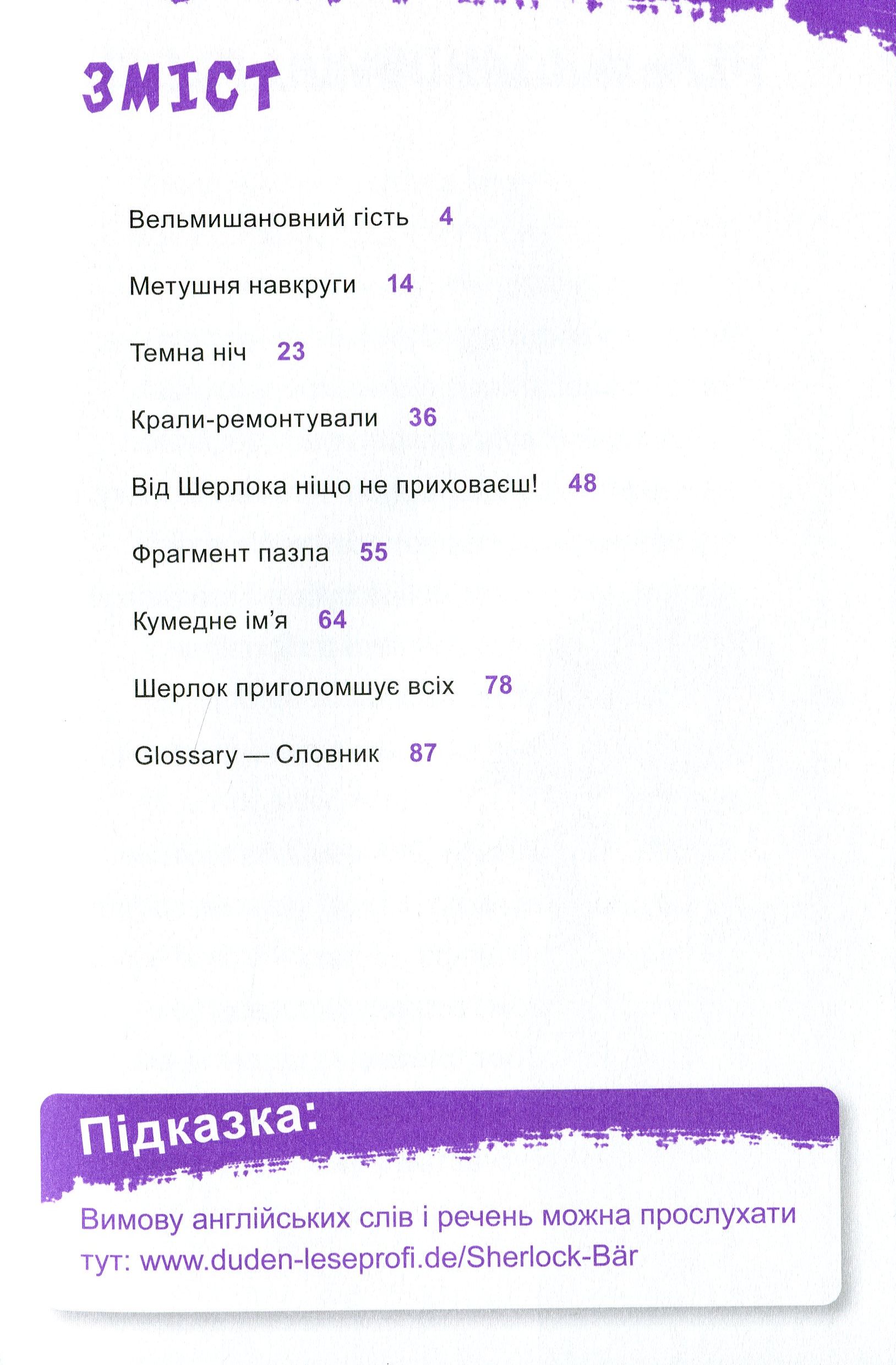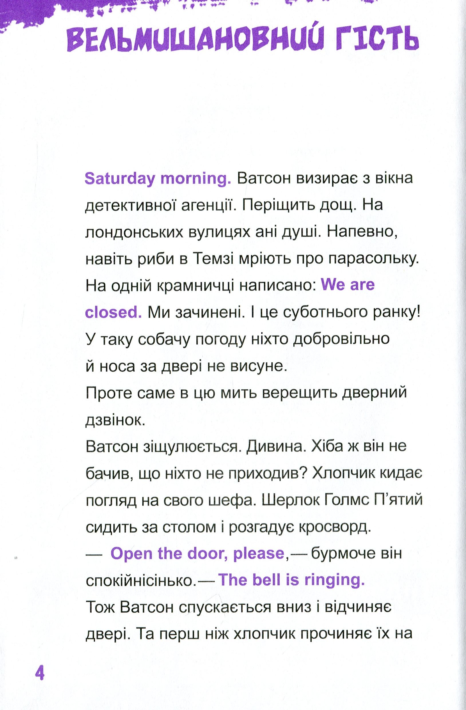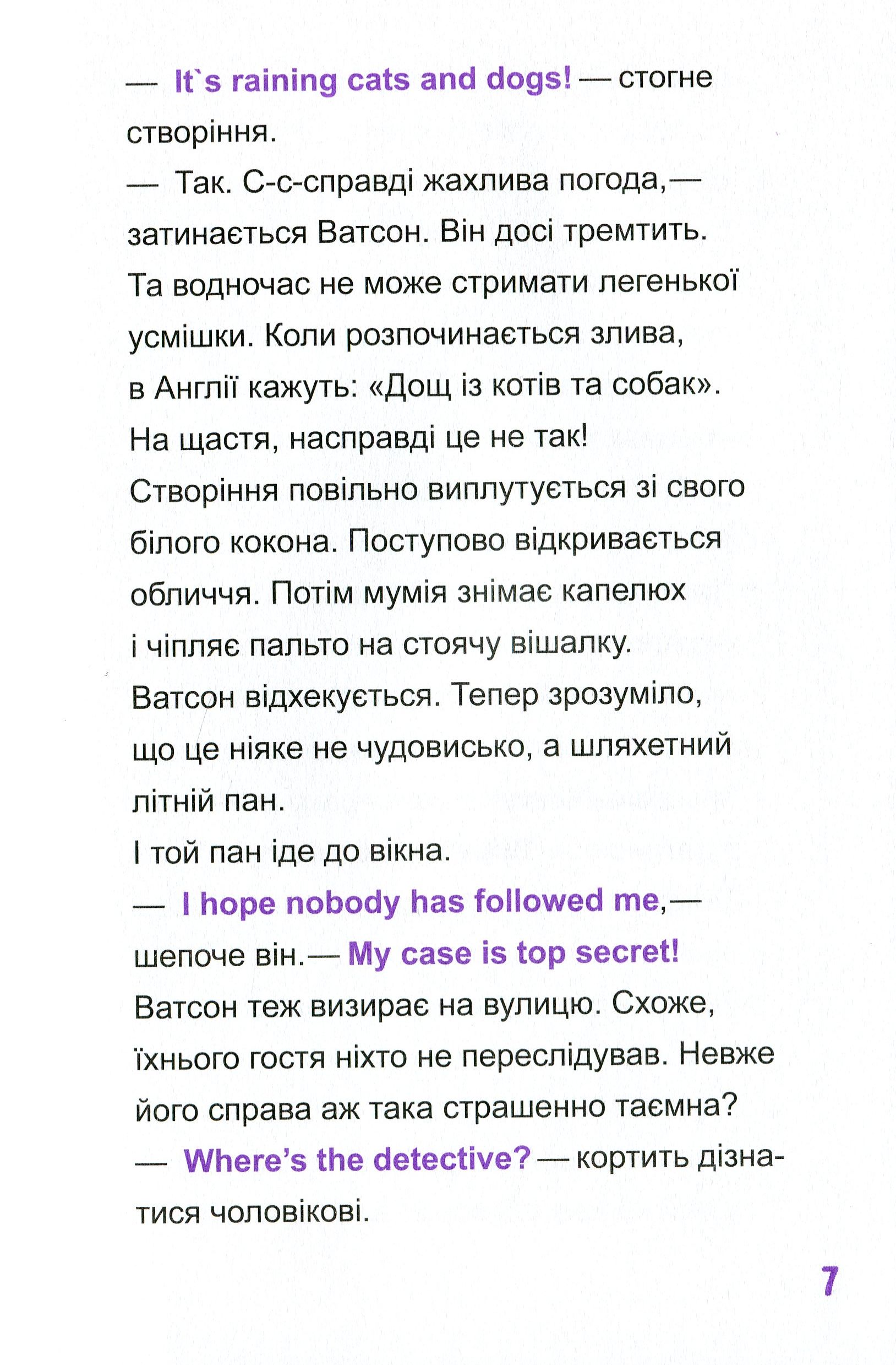 Attention, рlease! Ця захоплива книжка — справжній скарб для батьків і дітей. Детективні пригоди, цікаві головоломки, вивчення перших слів і висловів англійською для читачів молодшого шкільного віку, а також справжня дружба й неймовірні пригоди — усе це на її сторінках. Майже всі люди на Землі знають, хто такий Шерлок Голмс. Але не всі знають, що в нього є не менш талановитий нащадок — Шерлок Голмс П’ятий.
