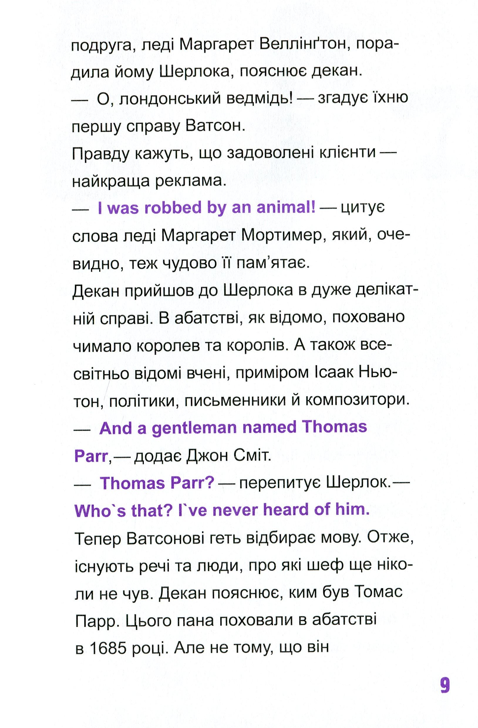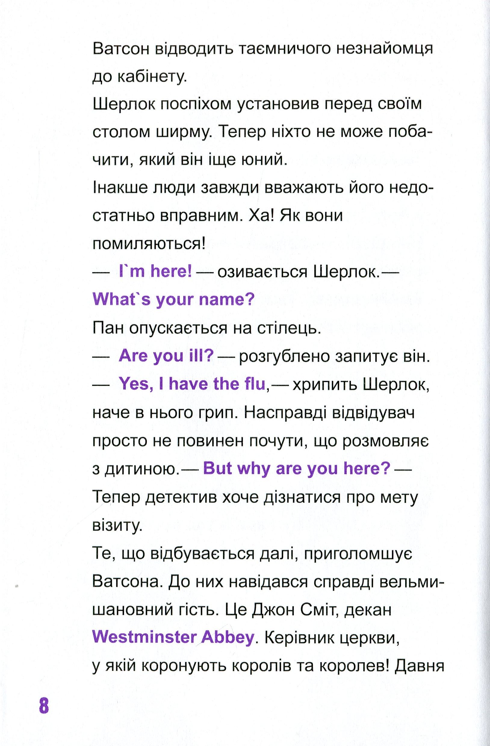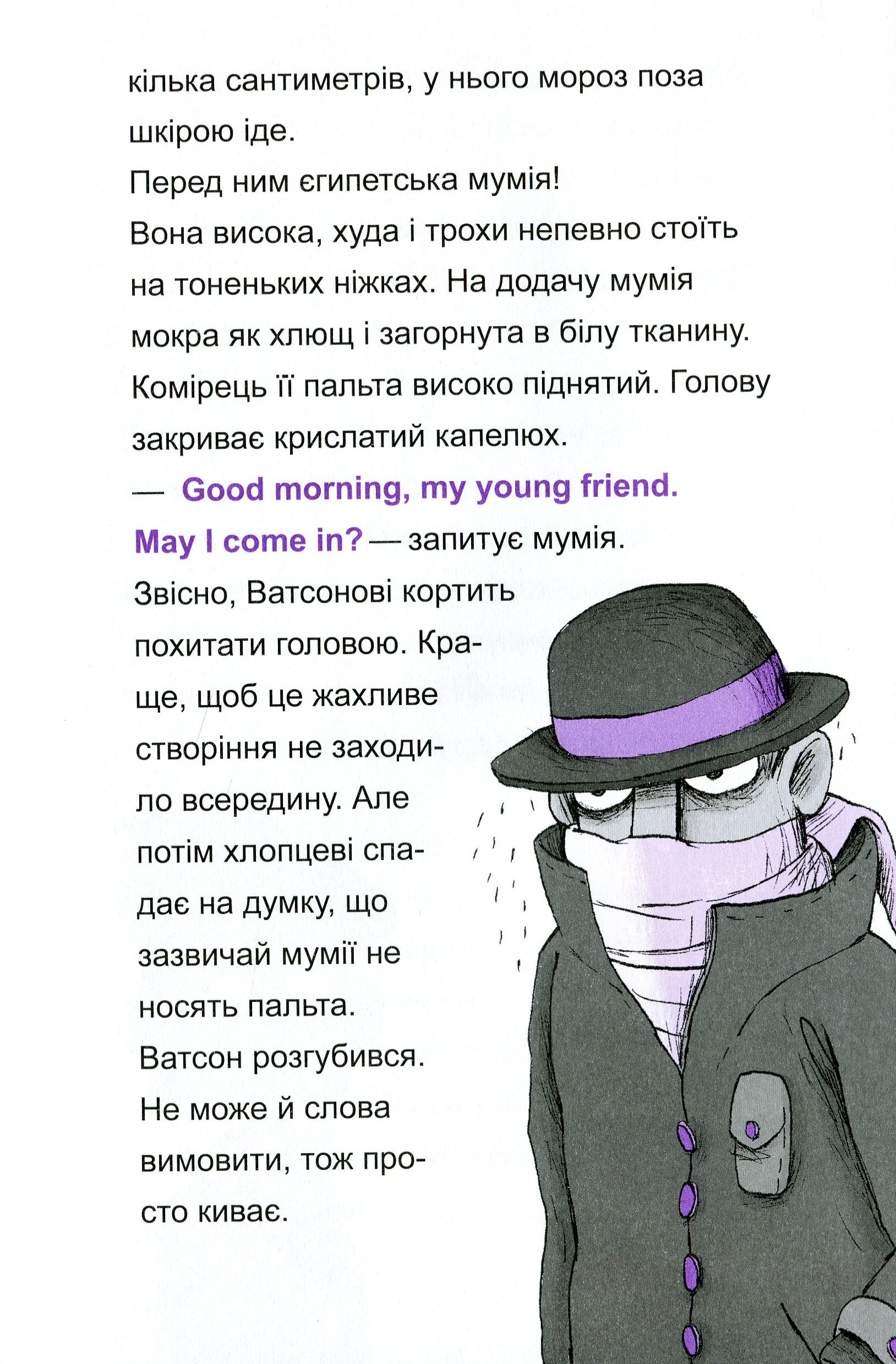 Attention, рlease! Ця захоплива книжка — справжній скарб для батьків і дітей. Детективні пригоди, цікаві головоломки, вивчення перших слів і висловів англійською для читачів молодшого шкільного віку, а також справжня дружба й неймовірні пригоди — усе це на її сторінках. Майже всі люди на Землі знають, хто такий Шерлок Голмс. Але не всі знають, що в нього є не менш талановитий нащадок — Шерлок Голмс П’ятий.