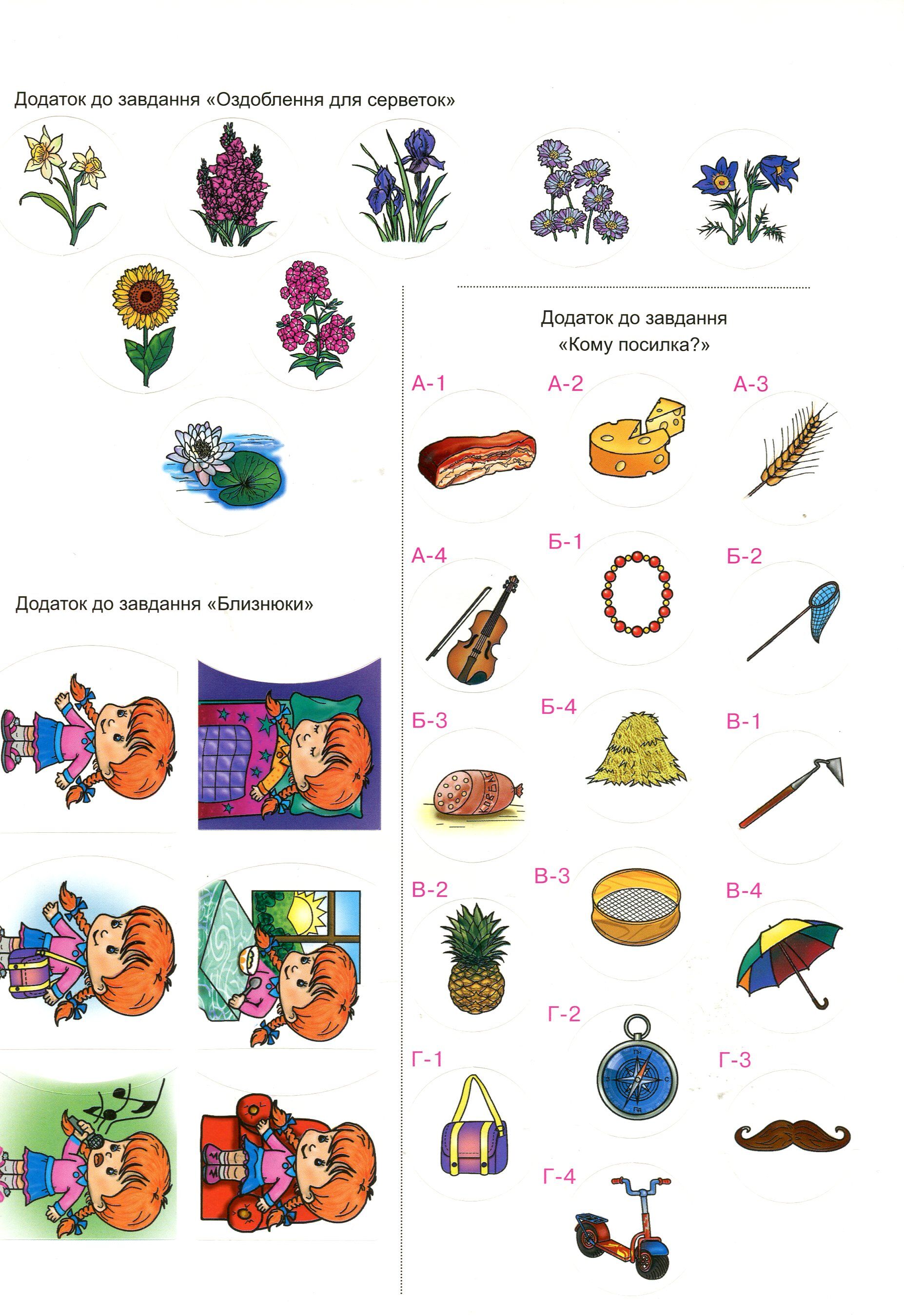 Як працювати з посібником? До завдань на сторінках 2,3,7,8,11,12 у додатку подано наліпки. На занятті дитині пропонують послухати завдання, вибрати потрібні малюнки і приклеїти їх.